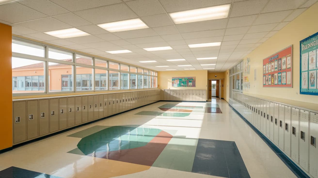 VCT tile in classrooms and hallways degrades rapidly under heavy foot traffic, furniture drag, and repeated cleaning chemical exposure. Without annual stripping and waxing, floors become porous, dull, and impossible to fully sanitize.