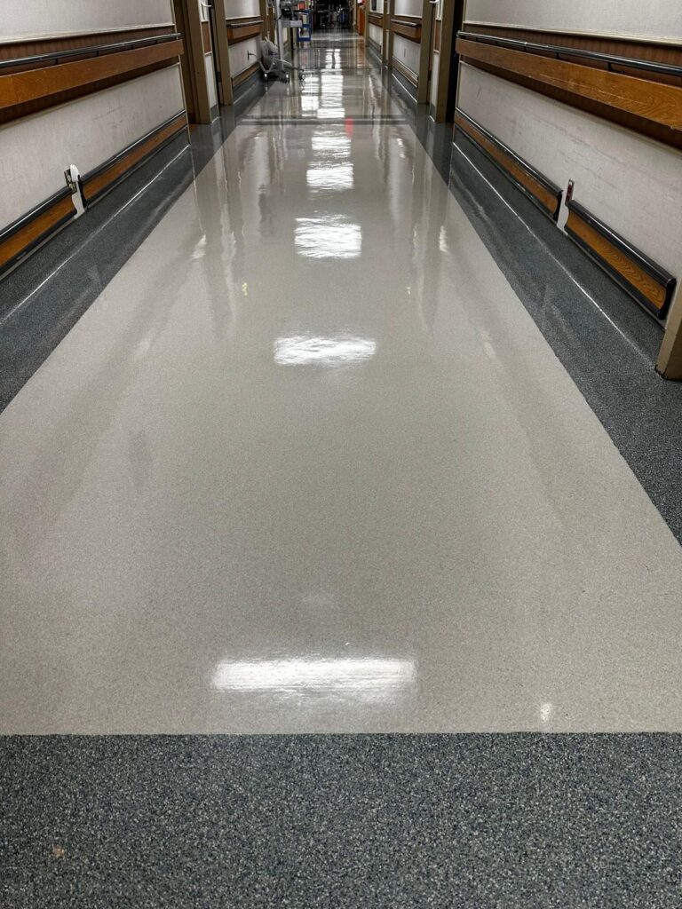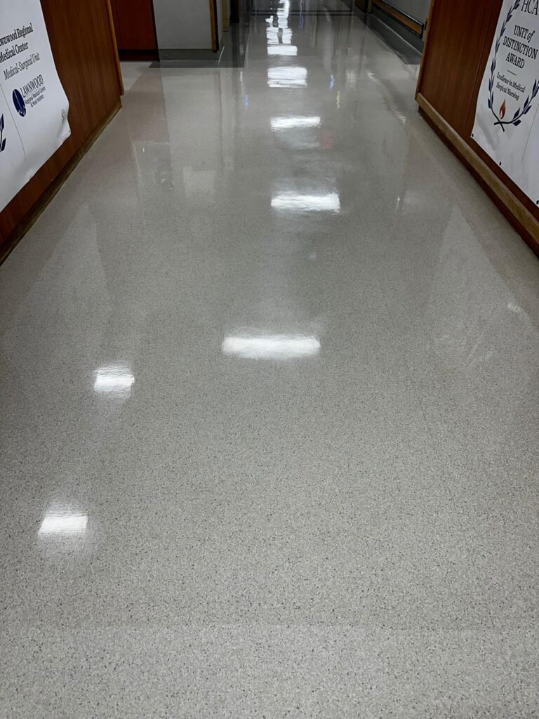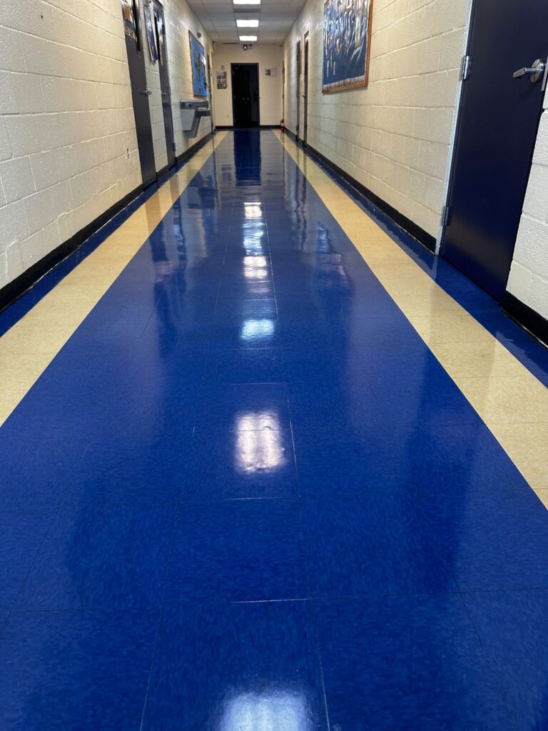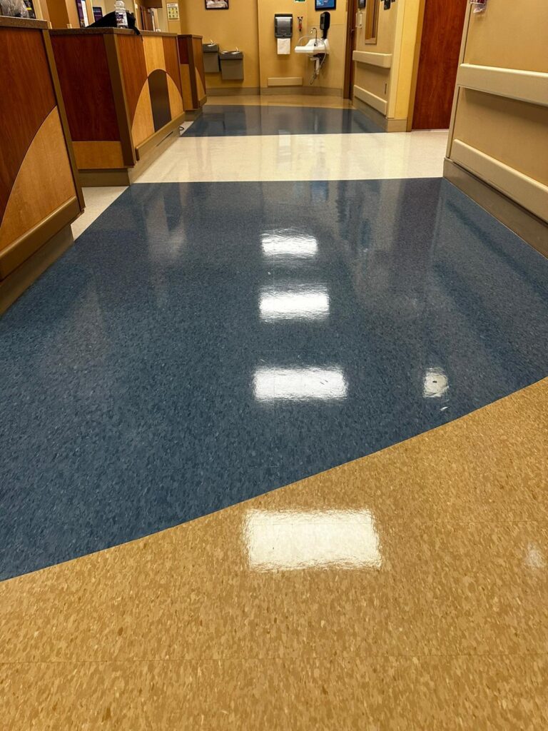 We service VCT (Vinyl Composition Tile), LVT, linoleum, and commercial vinyl sheet flooring in offices, clinics, schools, retail, and government buildings.
